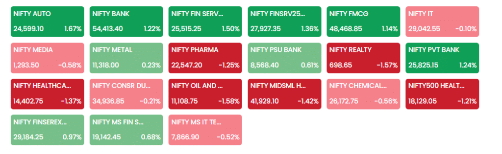 सेक्टर के लिहाज से Nifty Auto में सबसे ज्यादा तेजी देखने को मिली. इसके अलावा, Nifty Financial Services और Nifty Private Bank इंडेक्स ने भी बेहतर प्रदर्शन किया. दूसरी ओर Nifty Realty अपने सेक्टर के अन्य इंडेक्स के मुकाबले कमजोर रहा.