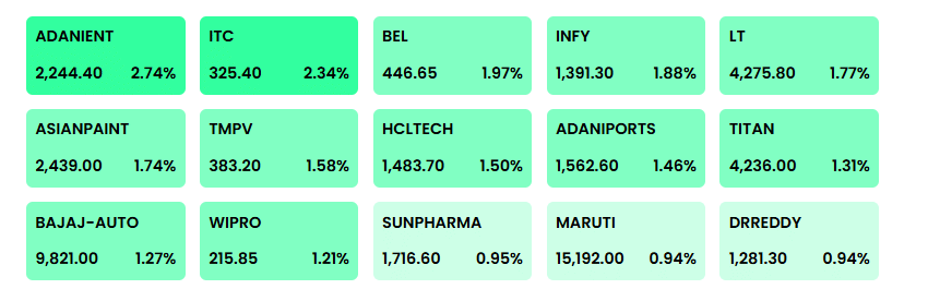 निफ्टी में टॉप गेनर शेयरों में Adani Enterprises, ITC, Bharat Electronics Limited, Infosys और Larsen & Toubro शामिल रहे.