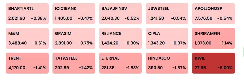 निफ्टी के टॉप लूजर शेयरों में Eternal Limited, Trent, Hindalco Industries, Reliance Industries और Tata Steel शामिल रहे.
