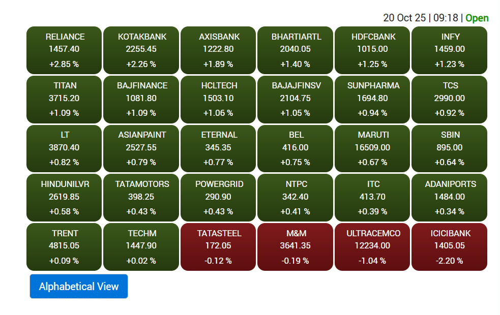 Stock Market Opening Bell: बाजार में लगातार तेजी जारी है. आज, 20 अक्टूबर को बाजार तेजी के साथ खुला. शुरुआती कारोबार में सेंसेक्स 460 अंकों की तेजी के साथ 84,380 के लेवल पर, वहीं निफ्टी 142 अंक उछलकर 25,847 के स्तर पर कारोबार कर रहा था. इस दौरान सेंसेक्स के 30 शेयरों में 27 में तेजी और 3 में गिरावट देखने को मिली. इस दौरान निफ्टी के सभी सेक्टोरल इंडेक्स में तेजी देखने को मिली.