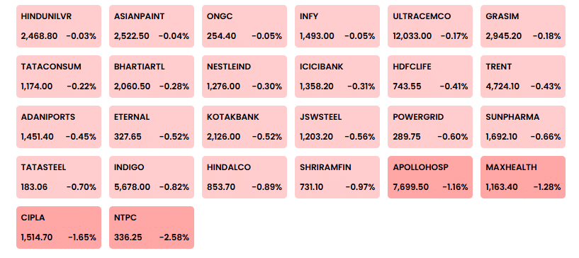 गुरुवार, 30 अक्टूबर को घरेलू शेयर बाजारों में भारी बिकवाली देखने को मिली. सेंसेक्स 593 अंक गिरकर 84,404 के स्तर पर बंद हुआ, जबकि निफ्टी 176 अंक फिसलकर 25,878 पर आ गया. सेंसेक्स के 30 में से 23 शेयर लाल निशान में बंद हुए. भारती एयरटेल, पावर ग्रिड, टेक महिंद्रा और इंफोसिस के शेयरों में 1.5 फीसदी तक की गिरावट दर्ज की गई. वहीं, L&T और BEL के शेयर बढ़त के साथ बंद हुए. निफ्टी के 50 में से 40 शेयरों में गिरावट रही और NSE के लगभग सभी सेक्टोरल इंडेक्स कमजोरी के साथ बंद हुए