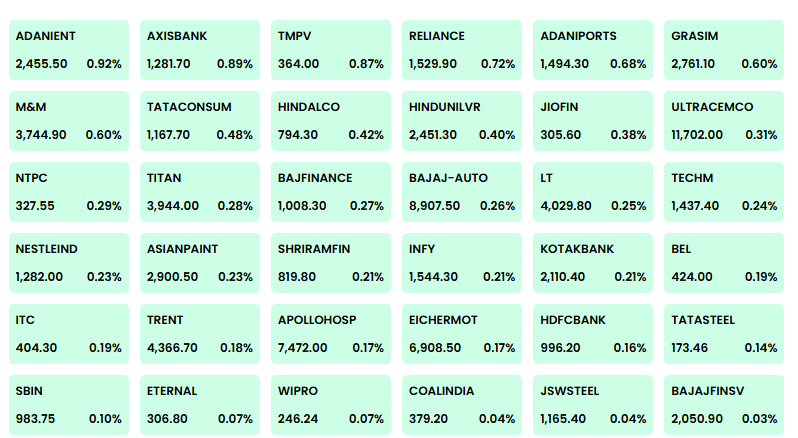 गुरुवार को बाजार तेजी के साथ खुला. इसके पहले बुधवार को भी बाजार में शानदारि तेजी रही थी. बाजार में ब्रॉडली खरीदारी दिखी, जिसमें 1447 शेयर बढ़त, 734 शेयर गिरावट और 171 शेयर बिना बदलाव के रहे. निफ्टी पर आज रिलायंस इंडस्ट्रीज, टेक महिंद्रा, टाटा कंज्यूमर, श्रीराम फाइनेंस और हिंडाल्को प्रमुख गेनर्स रहे, जबकि ICICI बैंक और मारुति सुज़ुकी दबाव में दिखे.