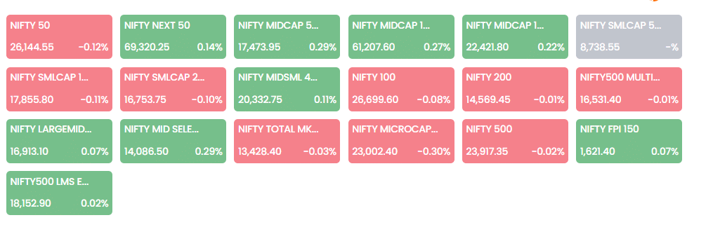 Stock Market Opening Bell: मिले-जुले ग्लोबल संकेतों के चलते 2 दिसंबर को भारतीय बाजार कमजोरी के साथ खुले, जहां Nifty 26,150 के नीचे रहा. Sensex 233.32 अंक या 0.27 फीसदी गिरकर 85,408.58 पर बंद हुआ, जबकि Nifty 67.70 अंक या 0.26 फीसदी फिसलकर 26,108.05 पर रहा. बाजार में 214 शेयर बढे, 265 शेयर गिरे और 54 बिना बदलाव रहे. Nifty के प्रमुख gainers में Asian Paints, Maruti Suzuki, NTPC, SBI और Trent शामिल रहे, जबकि ICICI Bank, Bajaj Finserv, Bajaj Finance, Shriram Finance और Reliance Industries कमजोरी के साथ कामकाज कर रहे थे. अगर सेक्टोरल इंडेक्स की बात करें तो मेटल, बैंक, मीडिया शेयरों में गिरावट देखने को मिली.