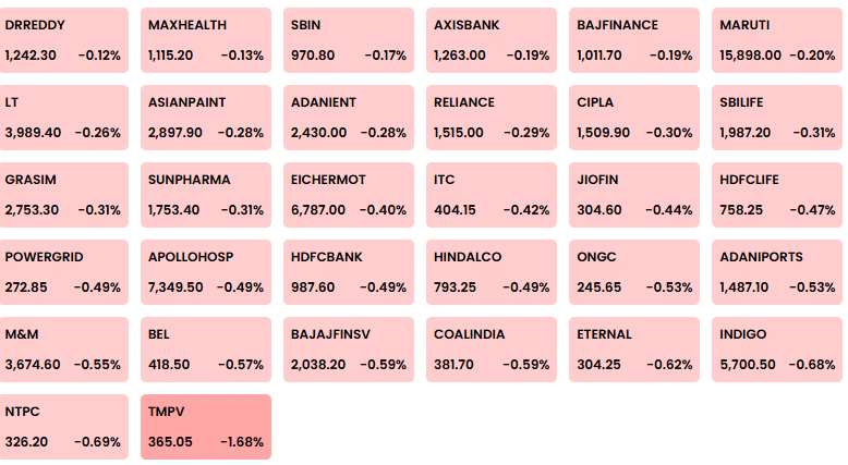 कल बाजार में जोरदार बिकवाली देखने को मिली. सेंसेक्स 277 अंक टूटकर 84,673 पर बंद हुआ, जबकि निफ्टी 103 अंक की गिरावट के साथ 25,910 के स्तर पर क्लोज हुआ. सेंसेक्स के 30 में से 23 शेयर लाल निशान में बंद हुए और सिर्फ 7 में बढ़त देखने को मिली. फाइनेंशियल, आईटी और ऑटो सेक्टर पर दबाव ज्यादा रहा. टेक महिंद्रा का शेयर 2.21 फीसदी गिरा, जबकि इंफोसिस में 1.33 फीसदी की कमजोरी देखने को मिली.