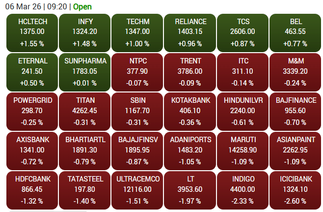 - आईटी शेयरों में HCLTech +1.55%, Infosys +1.48%, Tech Mahindra +1.00% और Tata Consultancy Services +0.87% की बढ़त दर्ज की गई. इसके अलावा Reliance Industries +0.96% और Bharat Electronics Limited +0.77% की बढ़त के साथ हरे निशान में रहे.