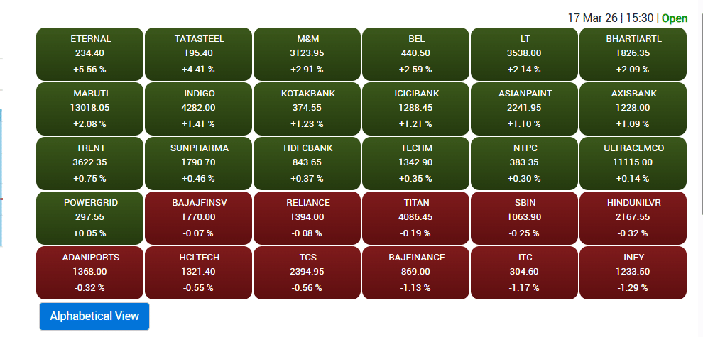 भारतीय शेयर बाजार में लगातार दूसरे दिन भी रिकवरी देखने को मिली. कारोबार के अंत में निफ्टी 172.35 अंक यानी 0.74 फीसदी की बढ़त के साथ 23,581.15 के स्तर पर बंद हुआ. वहीं सेंसेक्स 568 अंक यानी 0.75 फीसदी चढ़कर 76,070.84 पर बंद हुआ. निफ्टी में Eternal, Tata Steel और Mahindra & Mahindra के शेयर टॉप गेनर्स रहे. सेक्टोरल आधार पर FMCG और IT को छोड़कर बाकी सभी सेक्टर हरे निशान में बंद हुए.