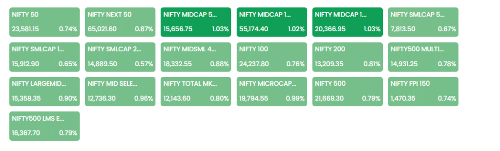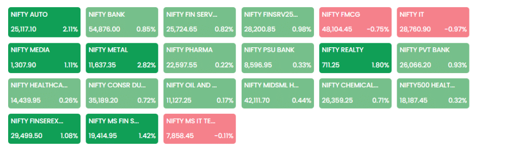 ब्रॉडर मार्केट में भी खरीदारी देखने को मिली. Nifty Midcap और Nifty Smallcap इंडेक्स क्रमशः 1.07 फीसदी और 0.78 फीसदी की बढ़त के साथ बंद हुए. सेक्टोरल इंडेक्स की बात करें तो Nifty Metal और Nifty Auto ने बेंचमार्क से बेहतर प्रदर्शन किया, जबकि Nifty IT और Nifty FMCG इंडेक्स में कमजोरी देखने को मिली.