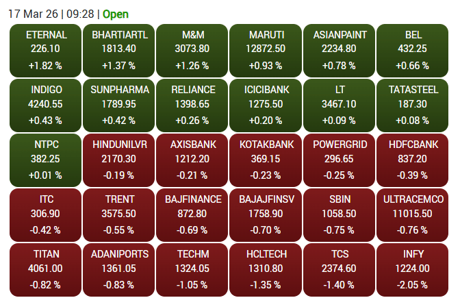 भारतीय शेयर बाजार 17 मार्च को बढ़त के साथ खुला, लेकिन जल्द ही गिरावट में आ गया. निफ्टी 84 अंक और सेंसेक्स 324 अंक चढ़कर खुले. ऑटो-टेलीकॉम शेयरों में तेजी रही, जबकि आईटी और बैंकिंग सेक्टर में दबाव देखने को मिला.