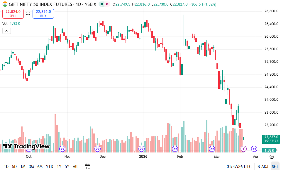 GIFT Nifty करीब 22825 के स्तर पर ट्रेड कर रहा है और इसमें लगभग 306 अंकों की गिरावट देखी गई है. इससे संकेत मिल रहा है कि भारतीय बाजार की शुरुआत कमजोर रह सकती है.
