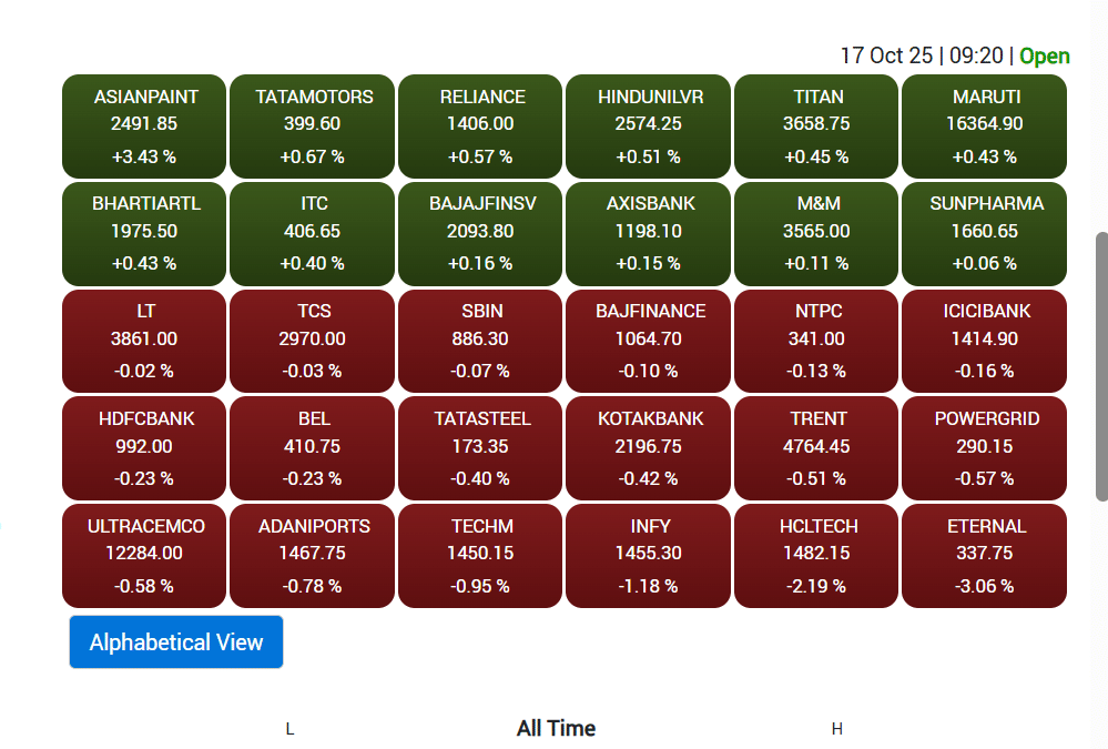 Stock Market Opening Bell: कल की जोरदार तेजी के बाद आज, 17 अक्टूबर को बाजार गिरावट के साथ खुला. हालांकि चंद मिनटों में ही इसने अपनी चाल बदल दी और हरे निशान में आ गया. शुरुआती कारोबार में सेंसेक्स 116 अंकों की तेजी के साथ 83,581 के लेवल पर, वहीं निफ्टी 19 अंक चढ़कर 25,602 के स्तर पर कारोबार कर रहा था. इस दौरान सेंसेक्स के 30 शेयरों में 12 में तेजी और 18 में गिरावट देखने को मिली. इस दौरान निफ्टी के सेक्टोरल इंडेक्स में आईटी और मीडिया इंडेक्स 1 फीसदी नीचे कारोबार करते नजर आए.