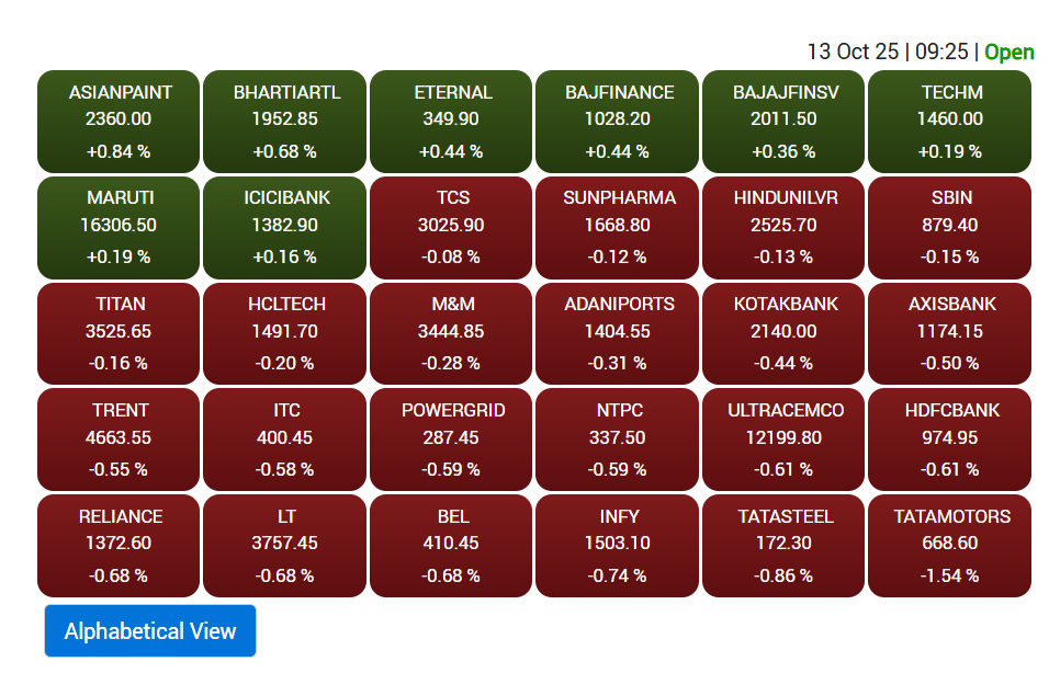 Stock Market Opening Bell: आज, 13 अक्तूबर को भारतीय बाजार गिरावट के साथ खुला. शुरुआती कारोबार में सेंसेक्स 254 अंकों की गिरावट के साथ 82,255 के लेवल पर, वहीं निफ्टी 70 अंक गिरकर 25,207 के स्तर पर कारोबार कर रहा था. इस दौरान सेंसेक्स के 30 शेयरों में 8 में तेजी और 22 में गिरावट देखने को मिली. इस दौरान निफ्टी के सेक्टोरल इंडेक्स में आईटी, पीएसयू बैंक और मेटल शेयरों में भारी गिरावट देखने को मिली.
