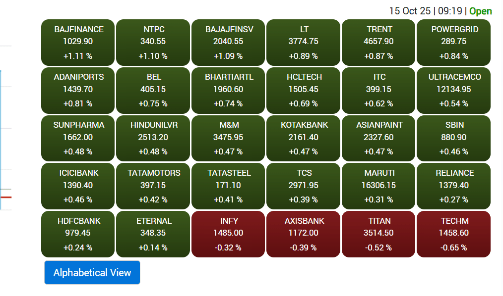 Stock Market Opening Bell: कल की गिरावट के बाद आज, 15 अक्टूबर को बाजार तेजी के साथ खुला. शुरुआती कारोबार में सेंसेक्स 319 अंकों की तेजी के साथ 82,340 के लेवल पर, वहीं निफ्टी 96 अंक उछलकर 25,236 के स्तर पर कारोबार कर रहा था. इस दौरान सेंसेक्स के 30 शेयरों में 26 में तेजी और 4 में गिरावट देखने को मिली. इस दौरान निफ्टी के सेक्टोरल इंडेक्स में मीडिया इंडेक्स छोड़कर सभी में तेजी देखने को मिली.