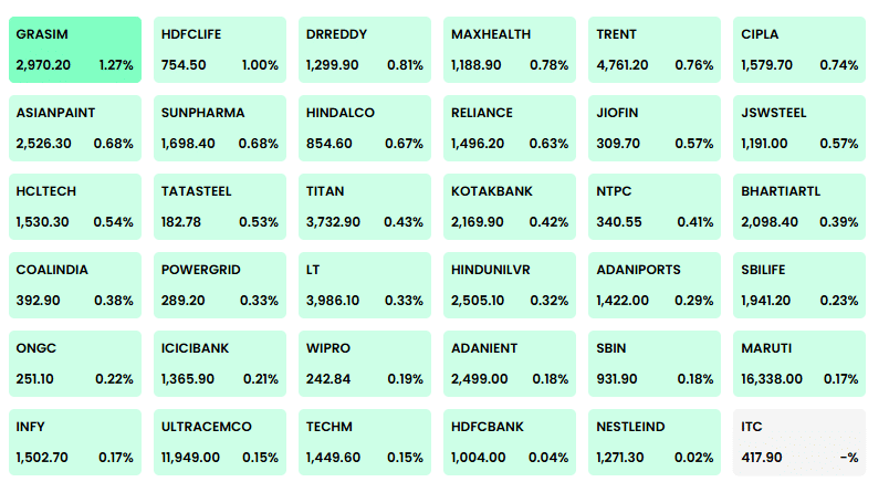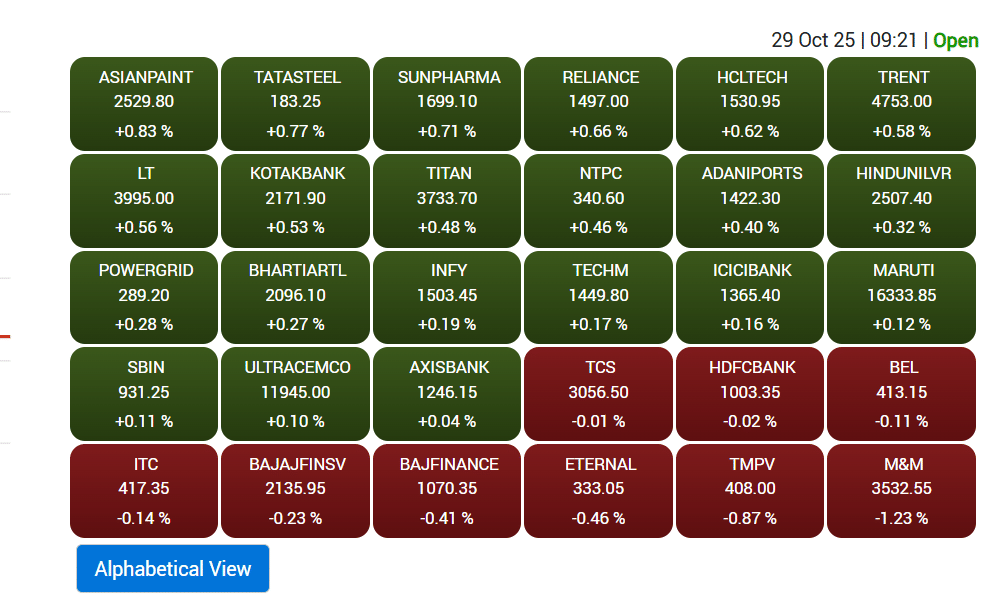 Stock Market Opening Bell: बुधवार, 29 अक्टूबर को ग्लोबल मार्केट से मिले पॉजिटिव संकेतों के बीच भारतीय शेयर बाजारों ने हल्की बढ़त के साथ शुरुआत की. सेंसेक्स 231 अंक या 0.27 फीसदी चढ़कर 84,859.31 के स्तर पर खुला, जबकि निफ्टी 77 अंक या 0.30 फीसदी बढ़कर 26,013.40 पर पहुंच गया. निफ्टी के प्रमुख गेनर्स में मैक्स हेल्थकेयर, ट्रेंट, रिलायंस इंडस्ट्रीज, टाइटन कंपनी और हिंडाल्को शामिल रहे. वहीं, श्रीराम फाइनेंस आज का प्रमुख लूजर रहा. कारोबार के दौरान मेटल और फार्मा शेयरों में तेजी देखने को मिली.