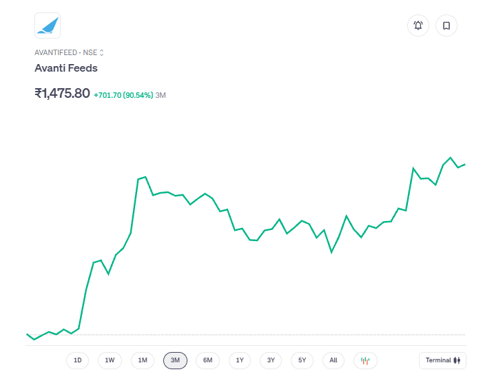 अवंती फीड्स का शेयर करीब 90.5% चढ़ा है. झींगा (shrimp) निर्यात में सुधार और अंतरराष्ट्रीय बाजार में बढ़ती मांग ने कंपनी के बिजनेस को मजबूत किया है. इस तेजी के बाद कंपनी के शेयर 1,477 रुपये के आसपास कारोबार कर रहा है.