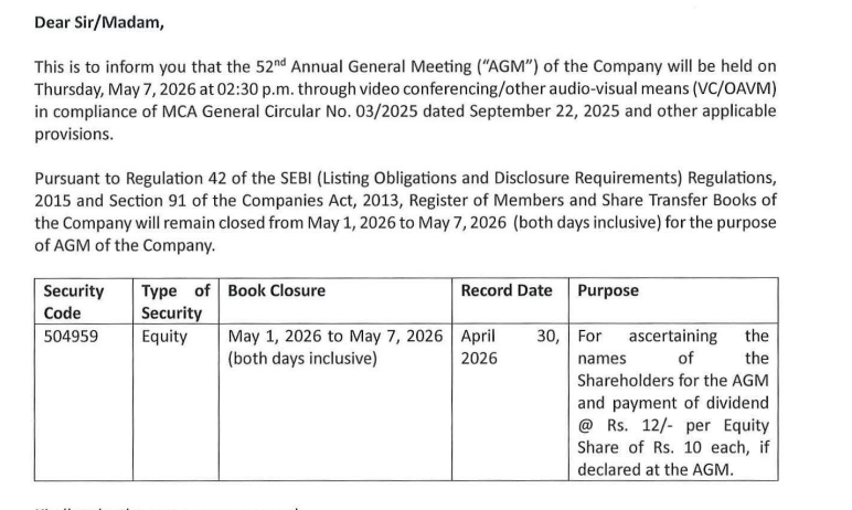 इस कंपनी ने निवेशकों के लिए 12 रुपये प्रति शेयर डिविडेंड का ऐलान किया है, जिसकी रिकॉर्ड डेट 30 अप्रैल 2026 तय की गई है. कंपनी की AGM में इस पर अंतिम मुहर लगेगी, जबकि शेयर का हालिया प्रदर्शन और फाइनेंशियल्स निवेशकों के लिए अहम संकेत दे रहे हैं.
