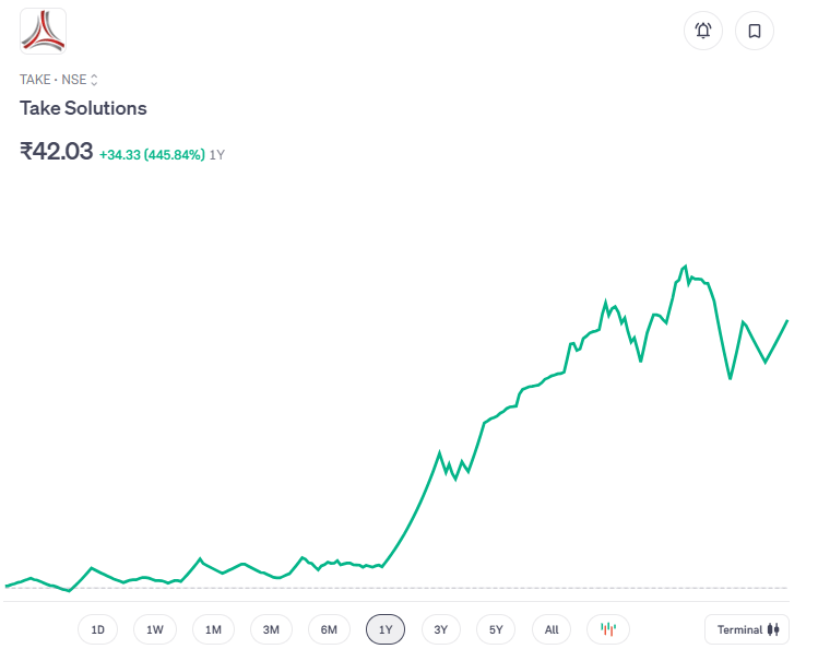 Take Solutions का शेयर पिछले एक साल में जबरदस्त प्रदर्शन कर चुका है. इस दौरान इसमें करीब 445% की तेजी आई है. वहीं, पिछले 6 महीनों में शेयर 200% से ज्यादा चढ़ा है और सिर्फ 1 महीने में करीब 28% की बढ़त दर्ज की गई है. फिलहाल, शेयर अपने 52 हफ्ते के उच्च स्तर ₹49.90 से करीब 16% नीचे है, जबकि इसका 52 हफ्ते का न्यूनतम स्तर ₹7.26 (अप्रैल 2025) रहा था.
