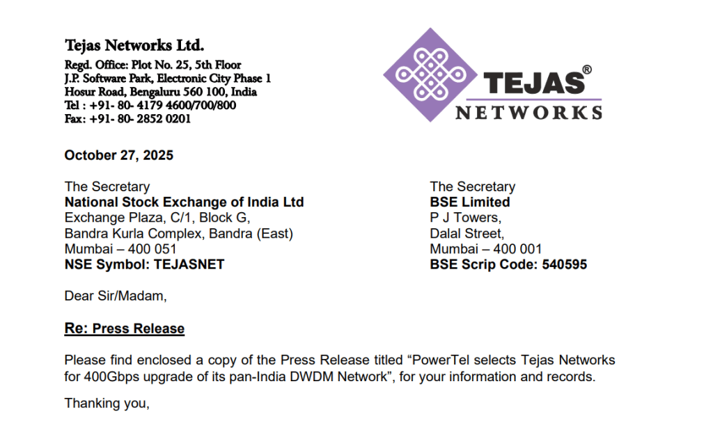 Tejas Networks Ltd (BSE: 540595, NSE: TEJASNET) ने घोषणा की है कि उसने PowerGrid Teleservices (PowerTel) से एक बड़ा टेलीकॉम कैपेसिटी ऑग्मेंटेशन प्रोजेक्ट जीता है. इस प्रोजेक्ट के तहत कंपनी को नेक्स्ट-जनरेशन SDN-बेस्ड DWDM नेटवर्क तैयार करना होगा.