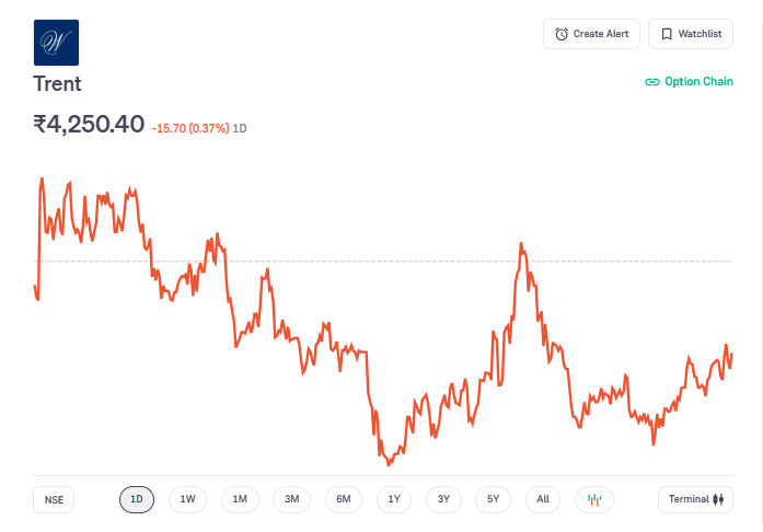 ट्रेंट टाटा की रिटेल कंपनी है जो वेस्टसाइड, जूडियो, स्टार बाजार जैसे ब्रांड चलाती है. इसका मार्केट कैप 1,51,112 करोड़ रुपए है. शेयर 7,493 रुपए के हाई से गिरकर अब 4,250 रुपए पर है यानी 43 फीसदी की गिरावट आई है. कंपनी का रिटर्न ऑन इक्विटी 26.58 फीसदी और रिटर्न ऑन कैपिटल 30.7 फीसदी है. कर्ज बहुत कम है सिर्फ 0.38 गुना इक्विटी का. पांच साल में निवेशकों को 480 फीसदी का रिटर्न मिला है.