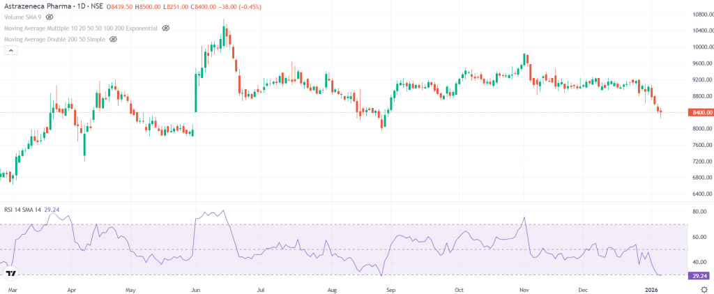 बुधवार को कंपनी का मार्केट कैप 20,946.63 करोड़ रुपये रहा. शेयर का भाव 8,378.65 रुपये था और RSI 29.24 रहा. शेयर ओवरसोल्ड जोन में है और यहां से शॉर्ट टर्म रिकवरी संभव है.