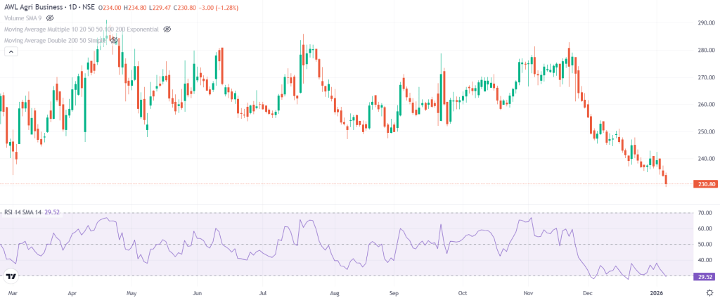 बुधवार तक कंपनी का मार्केट कैप 29,983.59 करोड़ रुपये है. शेयर का प्राइस 230.70 रुपये रहा और RSI 29.52 दर्ज किया गया. टेक्निकल तौर पर शेयर ओवरसोल्ड जोन में है और बाउंस की संभावना बनी हुई है.