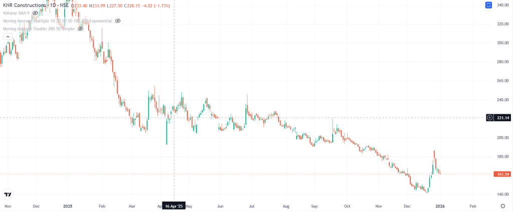 1 जनवरी 2026 को KNR Constructions का शेयर 0.76 प्रतिशत गिरकर 161.54 रुपये पर ट्रेड हो रहा था. पिछले एक हफ्ते में शेयर करीब 5.54 प्रतिशत फिसला है. तिमाही आधार पर इसमें 18.82 प्रतिशत की गिरावट आई है. जबकि एक साल में शेयर करीब 52.86 प्रतिशत टूट चुका है.