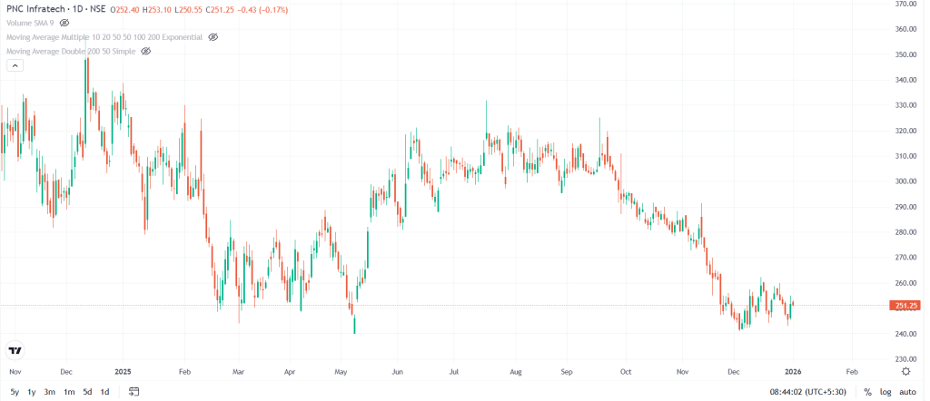 PNC Infratech का शेयर भी फिलहाल दबाव में है. शेयर करीब 0.17 प्रतिशत गिरकर 251.25 रुपये पर ट्रेड कर रहा है. पिछले एक हफ्ते में इसमें 0.8 प्रतिशत की गिरावट आई है. तिमाही आधार पर शेयर 14.7 प्रतिशत नीचे है. जबकि साल भर में इसमें 23.54 प्रतिशत की कमजोरी देखी गई है.