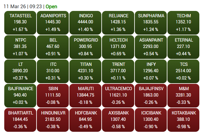 11 मार्च को घरेलू शेयर बाजार हल्की बढ़त के साथ खुला. सेंसेक्स 32.93 अंक चढ़कर 78,238.91 और निफ्टी 29.75 अंक बढ़कर 24,231.85 पर खुला. शुरुआती कारोबार में टाटा स्टील, अडानी पोर्ट्स और रिलायंस जैसे शेयरों में तेजी दिखी, जबकि बैंकिंग शेयरों में हल्की गिरावट का दबाव देखा गया
