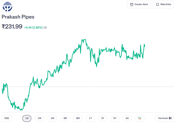 प्रकाश पाइप्स लिमिटेड उच्च गुणवत्ता वाले PVC पाइप्स और फिटिंग्स का निर्माण करती है और कृषि, निर्माण तथा इंफ्रास्ट्रक्चर क्षेत्रों में इसकी व्यापक मांग है. कंपनी का ध्यान इनोवेशन, सस्टेनेबिलिटी और वॉटर मैनेजमेंट सॉल्यूशंस पर केंद्रित है.
