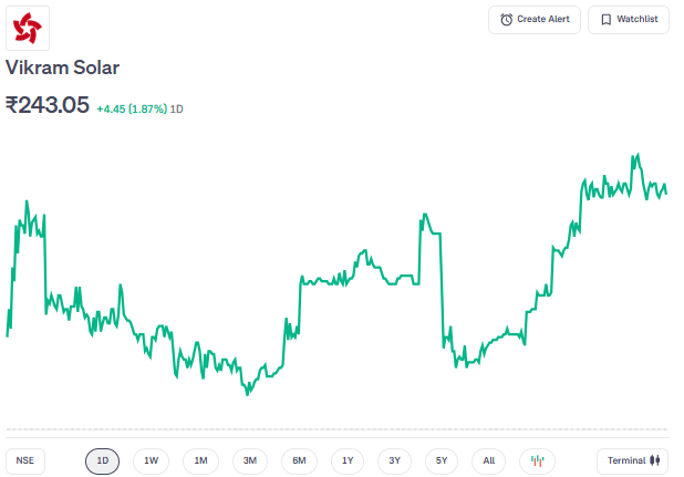 विक्रम सोलर हाई-एफिशिएंसी सोलर मॉड्यूल मैन्युफैक्चरिंग और EPC सेवाओं में अग्रणी कंपनी है. यह शेयर अपने 52-वीक हाई से करीब 40% नीचे ट्रेड कर रहा है. इसका वर्तमान प्राइस 243.05 रुपये है. Q2FY26 में कंपनी के नतीजे बेहद मजबूत रहे हैं. कंपनी के रेवेन्यू में 94% की बढ़ोतरी हुई, जबकि मुनाफा सालाना आधार पर 16 गुना से ज्यादा बढ़ा. कंपनी को एलएंडटी और अन्य कंपनियों से बड़े ऑर्डर मिले हैं, जिससे इसका ऑर्डर बुक 11.15 GW तक पहुंच गया है.