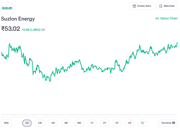 इस लिस्ट में तीसरा नाम सुजलॉन एनर्जी का है. यह विंड एनर्जी सॉल्यूशंस में देश की अग्रणी कंपनी है. इसके शेयर अपने 52-सप्ताह के उच्च स्तर से करीब 30% फिसल चुका है. यह फिलहाल 53 रुपये पर ट्रेड कर रहा है. Q2FY26 में सुजलॉन का रेवेन्यू और मुनाफा दोनों ही जोरदार रहे. कंपनी का ऑर्डर बुक 6 GW से ज्यादा का हो चुका है और FY26 के लिए 60% सालाना ग्रोथ का गाइडेंस दिया गया है.