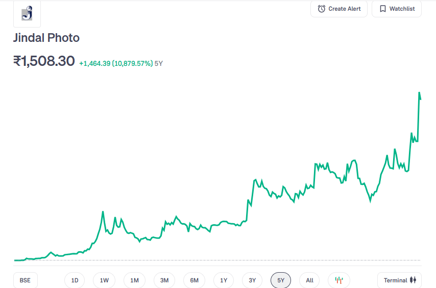 BSE के डेटा के अनुसार जिंदल फोटो (Jindal Photo) के शेयरों ने बीते 5 सालों में 10879 फीसदी का रिटर्न दिया है यानी निवेशकों का पैसा 108 गुना बढ़ गया है. अगर किसी निवेशक ने 5 साल पहले इसमें 1 लाख रुपये का निवेश किया होता तो वो आज करीब 1.09 करोड़ रुपये बन गए होते. इतना रिटर्न गोल्ड या प्रॉपर्टी ने बीते 5 सालों में नहीं दिया है.