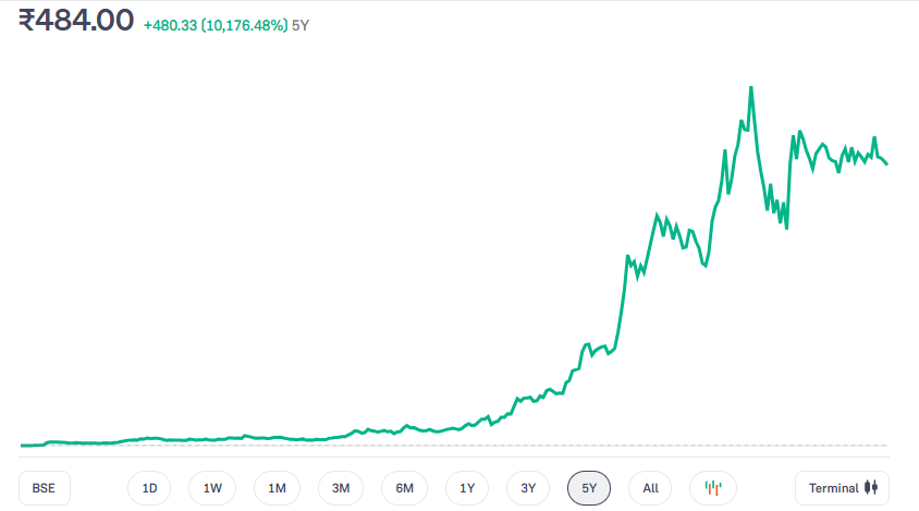 ट्रांसफार्मर एंड रेक्टिफायर (Transformers and Rectifiers) के शेयरों ने भी बीते 5 सालों में धमाकेदार प्रदर्शन किया है. इस दौरान इसके एक शेयर का भाव 4.56 रुपये से बढ़कर 484.75 रुपये पर पहुंच गया है. इससे निवेशकों को 10,176 फीसदी का रिटर्न दिया है. इस शेयर ने भी 1 लाख रुपये को 5 साल में 1 करोड़ रुपये से अधिक बना दिया है.