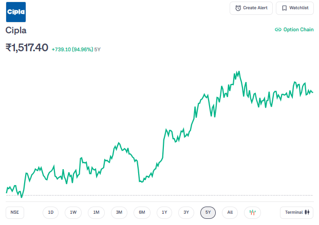 फार्मा सेक्टर की दिग्गज कंपनी Cipla अपनी मजबूत वैश्विक मौजूदगी और साफ-सुथरी बैलेंस शीट के चलते चर्चा में है. इस शेयर का करंट प्राइस 1,517 रुपये है. कंपनी का डेट-टू-इक्विटी रेशियो महज 0.01 है, जो इसके मजबूत वित्तीय अनुशासन को दर्शाता है. Cipla का शेयर करीब 22.5 के PE पर ट्रेड कर रहा है, जबकि फार्मा इंडस्ट्री का औसत PE लगभग 31 है. बीते पांच वर्षों में Cipla ने निवेशकों को करीब 95% का रिटर्न दिया है. Respiratory और HIV दवाओं में मजबूत पकड़ के साथ कंपनी की ग्रोथ आउटलुक स्थिर बनी हुई है.