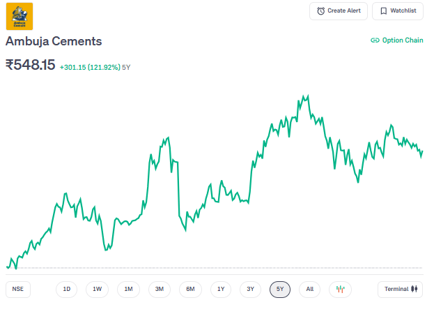 Ambuja Cements, जो अब Adani Cement का हिस्सा है. इसने तेजी से कंसोलिडेट हो रहे सीमेंट सेक्टर में मजबूत स्थिति बनाए रखी है. कंपनी की मार्केट हिस्सेदारी Q2 FY26 में 16.6% रही. Ambuja का डेट-टू-इक्विटी रेशियो सिर्फ 0.02 है और शेयर करीब 23.6 के PE पर ट्रेड कर रहा है, जबकि इंडस्ट्री औसत करीब 32.6 है. इसका वर्तमान शेयर प्राइस 548 रुपये है. बीते पांच साल में Ambuja Cements ने निवेशकों को 121% से ज्यादा रिटर्न दिया है.