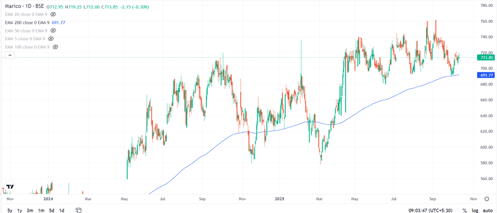 - Marico का स्टॉक 200-DMA के ऊपर सपोर्ट ले रहा है और यह टेक्निकली स्टेबल पोजिशन में दिखाई दे रहा है.
