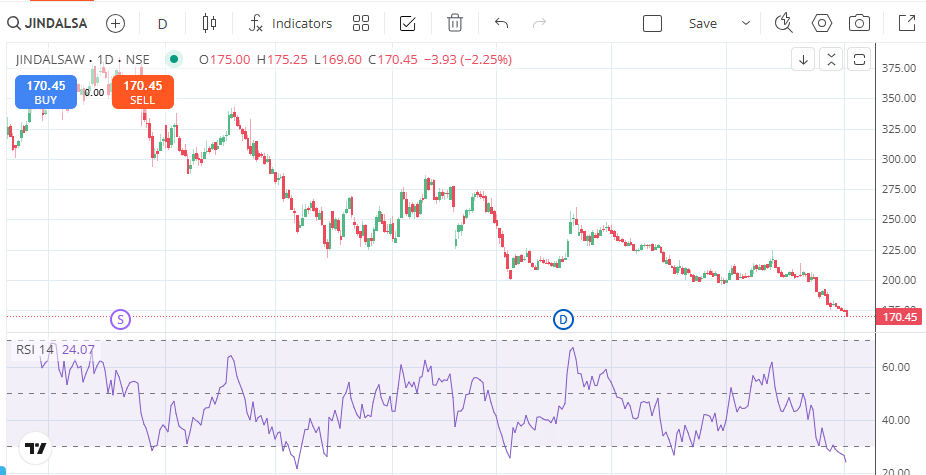 जिंदल सॉ लिमिटेड (Jindal Saw Ltd) लार्ज डायमीटर वाले स्टील पाइपों की प्रमुख निर्माता कंपनी है जिनका इस्तेमाल तेल, गैस और पानी के ट्रांसपोर्टेशन में किया जाता है. मजबूत इंफ्रास्ट्रक्चर और वैश्विक परिचालन के दम पर कंपनी भारत के औद्योगिक और ऊर्जा क्षेत्र में महत्वपूर्ण योगदान दे रही है. जिंदल सॉ गुणवत्तापूर्ण इंजीनियरिंग और टिकाऊ मैन्युफैक्चरिंग प्रक्रियाओं पर लगातार ध्यान केंद्रित करती है. मंगलवार को कंपनी का मार्केट कैप 10,929 करोड़ रहा और इसके शेयर 171 रुपये प्रति शेयर पर बंद हुए. यह शेयर RSI लेवल 30 से नीचे है. वर्तमान में इसका आरएसआई स्तर 24.07 दर्ज किया गया जो दर्शाता है कि शेयर वर्तमान में ‘ओवरसोल्ड जोन’ में है और निकट भविष्य में इसमें उछाल की संभावना बन सकती है.