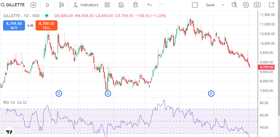 जिलेट इंडिया लिमिटेड (Gillette India Ltd), प्रॉक्टर एंड गैंबल ग्रुप का हिस्सा है जो भारत की अग्रणी पर्सनल केयर कंपनी है. यह Gillette और Oral-B जैसे प्रतिष्ठित ब्रांडों के लिए जानी जाती है. कंपनी ने इनोवेशन, मजबूत ब्रांड वैल्यू और उत्पाद गुणवत्ता पर निरंतर ध्यान देते हुए देश के ग्रूमिंग और शेविंग सेगमेंट में अपनी अग्रणी स्थिति कायम रखी है. मंगलवार को कंपनी का मार्केट कैप 28,467 करोड़ रुपये रहा जबकि इसका शेयर 8,735 रुपये प्रति शेयर पर बंद हुआ. यह भी RSI लेवल 30 से नीचे ट्रेड कर रहा है और वर्तमान में इसका RSI 24.32 है. यानी यह शेयर भी रिवर्सल के लिए रेडी है.