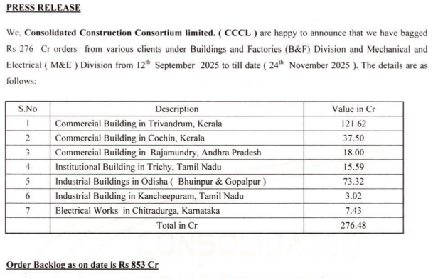 CCCL की फाइलिंग के अनुसार, कंपनी को 7 नए प्रोजेक्ट्स के लिए ऑर्डर मिले हैं.