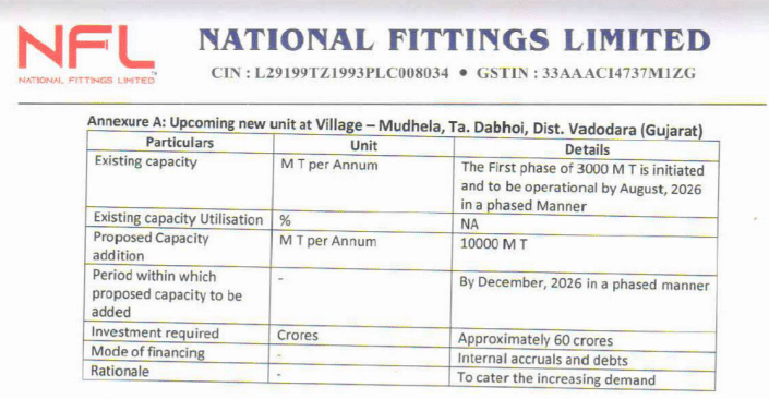 ₹60 करोड़ के कैपेक्स ऐलान के बाद National Fittings Ltd के शेयर में 7 जनवरी को जोरदार खरीदारी देखने को मिली और स्टॉक करीब 18% तक उछल गया. वडोदरा यूनिट के विस्तार से 10,000 MT क्षमता बढ़ाने की योजना है जिससे कंपनी के मीडियम-टर्म ग्रोथ आउटलुक को बल मिला. आइये कंपनी का पूरा प्लान जानते हैं.