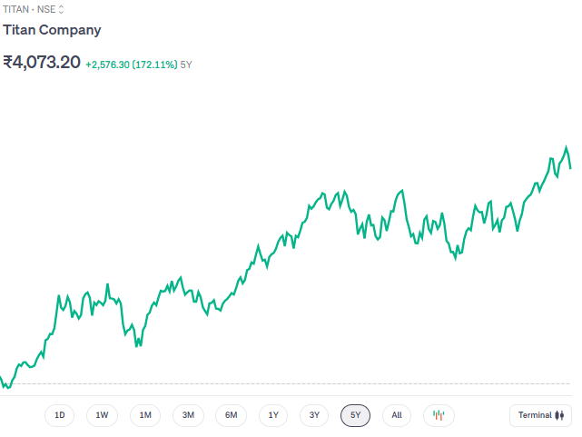 Titan का वित्तीय प्रदर्शन भी मजबूत रहा है. Q3FY26 में कंपनी की आय बढ़कर ₹25,416 करोड़ हो गई, जो पिछले साल की समान अवधि से 43 प्रतिशत ज्यादा है. कंपनी का EBITDA बढ़कर ₹2,713 करोड़ हो गया, जबकि नेट प्रॉफिट बढ़कर ₹1,684 करोड़ पहुंच गया. कंपनी ने पिछले 5 सालों में 172% का रिटर्न दिया है.