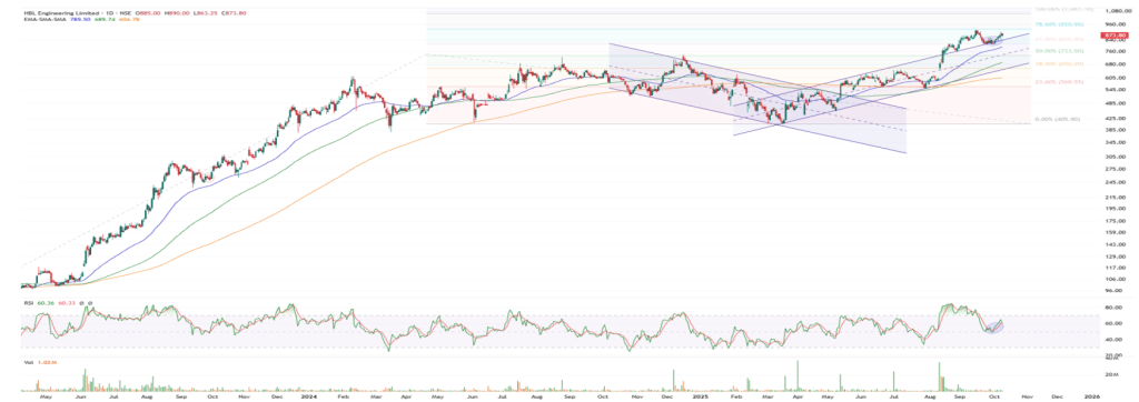 HBL इंजीनियरिंग के शेयरों में तेज उछाल के बाद हल्की गिरावट आई थी, जो अब खत्म होती दिख रही है. स्टॉक ने 825 रुपये के स्तर पर मजबूत सपोर्ट बनाया है और फिर से तेजी के संकेत दे रहा है. वॉल्यूम में सुधार और RSI इंडिकेटर में मजबूती से संकेत मिलते हैं कि यह स्टॉक फिर से ऊपर की ओर रुख कर सकता है.