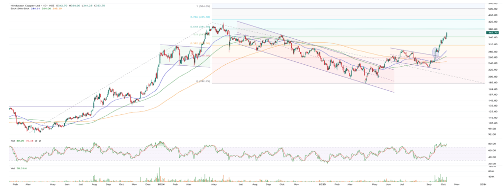 पिछले एक महीने में हिंदुस्तान कॉपर ने 245 रुपये के स्तर से लगातार मजबूती दिखाई है. मजबूत ट्रेंड और बढ़ते वॉल्यूम के चलते इसमें अभी और तेजी की संभावना है. RSI भी पॉजिटिव बना हुआ है, जिससे संकेत मिलता है कि शेयर थोड़ी स्थिरता या हल्की गिरावट के बाद फिर तेजी पकड़ सकता है.