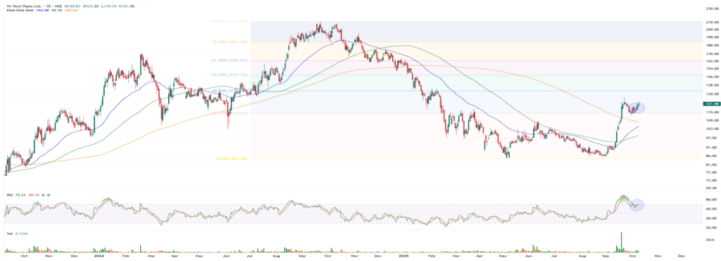 यह स्टॉक हाल ही में अपने 50EMA जोन (₹92 स्तर) से उछलकर मजबूत ट्रेंड दिखा चुका है. अब इसने फ्लैग पैटर्न बनाया है जो आगे तेजी की संभावना को बढ़ाता है. वॉल्यूम में बढ़ोतरी और RSI की स्थिति से साफ है कि आने वाले दिनों में इसमें नई खरीदारी हो सकती है.