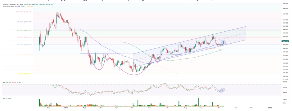 स्विगी के शेयरों ने पिछले चार महीनों में धीरे-धीरे एक आरोही चैनल पैटर्न (Ascending Channel) बनाया है. 418 रुपये के आसपास 50EMA सपोर्ट से संभलने के बाद इसमें दोबारा तेजी के संकेत मिले हैं. RSI पॉजिटिव ट्रेंड रिवर्सल दिखा रहा है, जो आने वाले दिनों में नए हाई की संभावना जताता है.