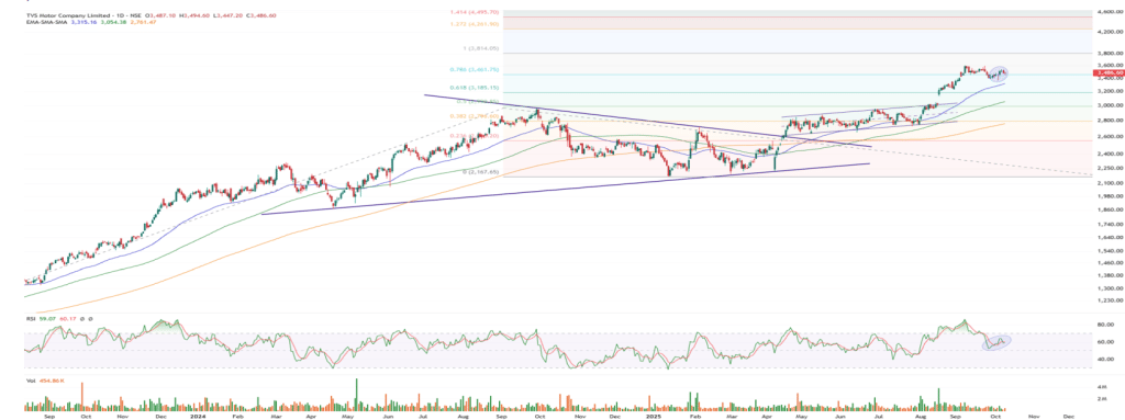 TVS मोटर पिछले 3-4 सालों से लंबी अवधि की मजबूती बनाए हुए है. ब्रोकरेज फर्म के मुताबिक, हालिया कंसोलिडेशन के बाद अब इसमें फिर से तेजी के संकेत मिल रहे हैं. RSI ओवरबॉट जोन से निकलकर संतुलित स्थिति में है, जो आगामी हफ्तों में नई तेजी की दिशा दिखा रहा है.