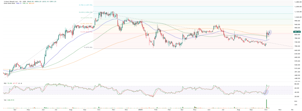 V-Mart के शेयरों ने हाल में 945 रुपये से गिरकर 700 रुपये का निचला स्तर छुआ था. लेकिन अब यह स्टॉक फिर से 200SMA और 100SMA से ऊपर निकल चुका है, जो मजबूत ट्रेंड की ओर इशारा करता है. फर्म के रिपोर्ट में टैक्निकल चार्ड पर इसमें फ्लैग पैटर्न बनता दिख रहा है, जो आगामी हफ्तों में नई तेजी का संकेत है.
