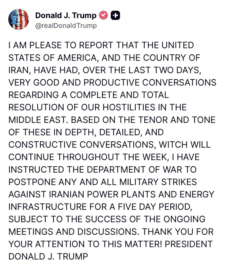 डोनाल्ड ट्रंप ने ईरान को लेकर अपने रुख में फिलहाल नरमी दिखाते हुए संभावित सैन्य कार्रवाई को टाल दिया है. उन्होंने रक्षा विभाग को निर्देश दिया है कि अगले पांच दिनों तक ईरान के ऊर्जा ढांचे या अन्य ठिकानों पर कोई हमला न किया जाए. यह फैसला ऐसे समय लिया गया है जब अमेरिका और ईरान के बीच बातचीत जारी है और कूटनीतिक स्तर पर समाधान निकालने की कोशिशें तेज हुई हैं.