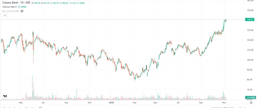Canara Bank का शेयर 1.03 फीसदी की तेजी के साथ 140.67 रुपये पर ट्रेड कर रहा है. पिछले सप्ताह में शेयर 2.69 फीसदी ऊपर गया है, जबकि पिछले तीन महीनों में 30.38 फीसदी और पिछले एक साल में 35.66 फीसदी की शानदार बढ़त दर्ज की है. बैंक का मार्केट कैप 1,27,596.85 करोड़ रुपये है (7 नवम्बर 2025 तक). हाल ही में बैंक ने 200 फीसदी का फाइनल डिविडेंड (4 रुपये प्रति शेयर) घोषित किया है.