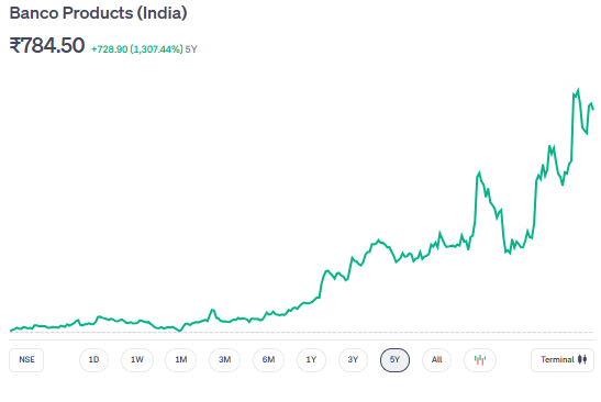 पिछले पांच सालों में, इन कंपनियों ने निवेशकों को शानदार मल्टीबैगर रिटर्न दिए हैं. इनमें सबसे आगे Banco Products है जिसने केवल पांच वर्षों में लगभग 1307 प्रतिशत रिटर्न दिया है. वर्ष 2020 में जहां इसके शेयर की कीमत 59.38 रुपये थी, वहीं अब यह बढ़कर मंगलवार को दोपहर 1 बजे 785 रुपये पर ट्रेड कर रहे हैं. कंपनी ने 13 नवंबर की बोर्ड मीटिंग में प्रति शेयर 7 रुपये का अंतरिम डिविडेंड घोषित किया है जो इसके 2 रुपये फेस वैल्यू पर 350 प्रतिशत के बराबर है. मंगलवार को इसके शेयर हल्की गिरावट दिखी.