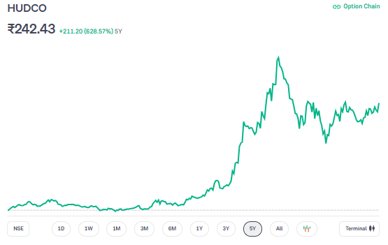 दूसरा बड़ा मल्टीबैगर स्टॉक Housing & Urban Development Corporation (HUDCO) है, जिसने पिछले पांच वर्षों में 628 प्रतिशत तक की जबरदस्त तेजी दिखाई है. इसके शेयर मंगलवार को दोपहर 1 बजे 246 रुपये पर कारोबार कर रहे थे और कंपनी की मार्केट कैपिटल 47925 करोड़ रुपये से ऊपर जा चुका है. HUDCO के बोर्ड ने 10 नवंबर को प्रति शेयर 1 रुपये का अंतरिम डिविडेंड घोषित किया है जिसकी फेस वैल्यू 10 रुपये है. इस कारण यह शेयर भी 19 नवंबर को एक्स-डिविडेंड ट्रेड करेगा.